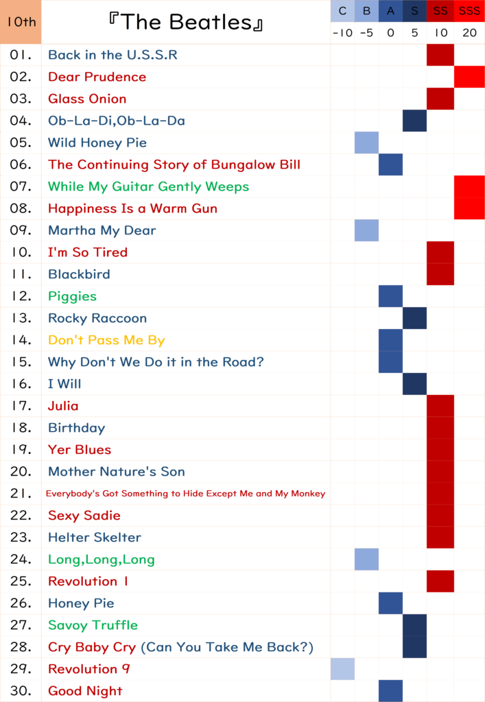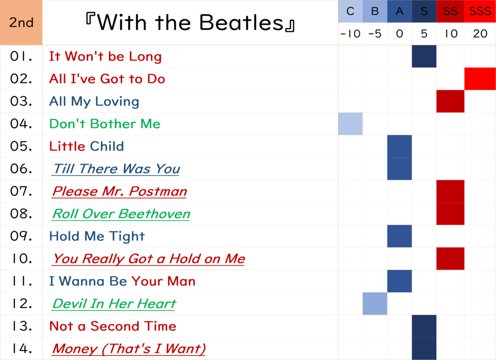 『A Hard Day’s Night』と『You Can’t Do That』以外SS級の楽曲が少なく全体的な【楽曲の好み】の数値が伸びず10位となりました。