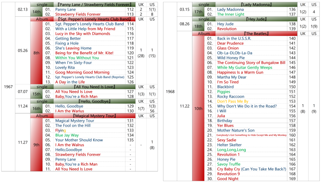 | record | single:『Panny Lane/Strawberry Fields Forever』(14th/1967.02.13) Album:『Magical Mystery Tour』(9th/1967.11.27) |