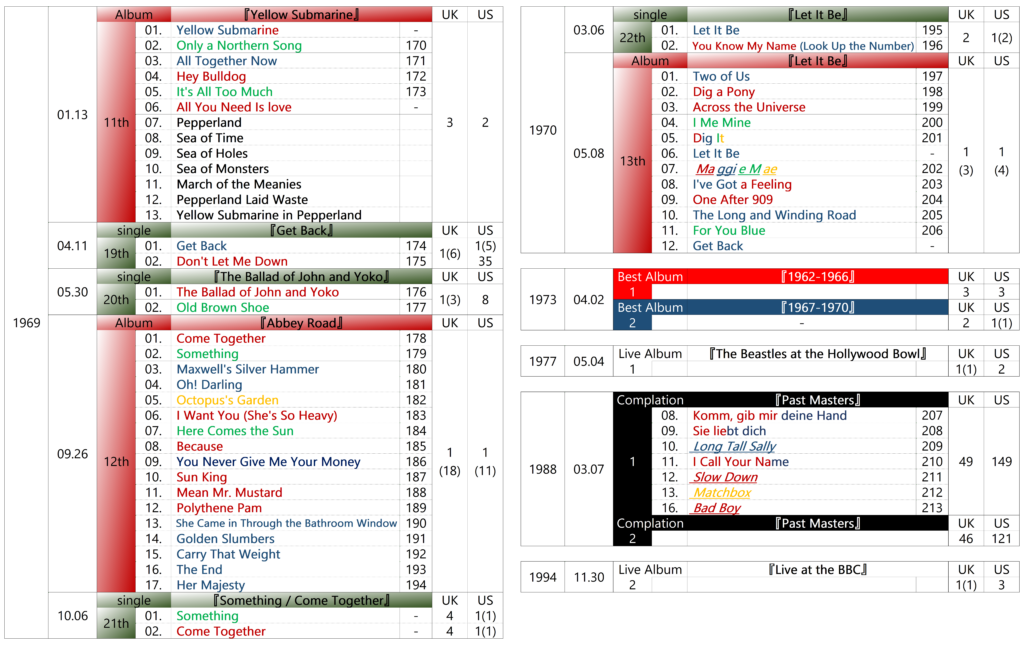 | record | Album:『Abbey Road』(12th/1969.09.26) single:『Something/Come Together』(21th/1969.10.06) |