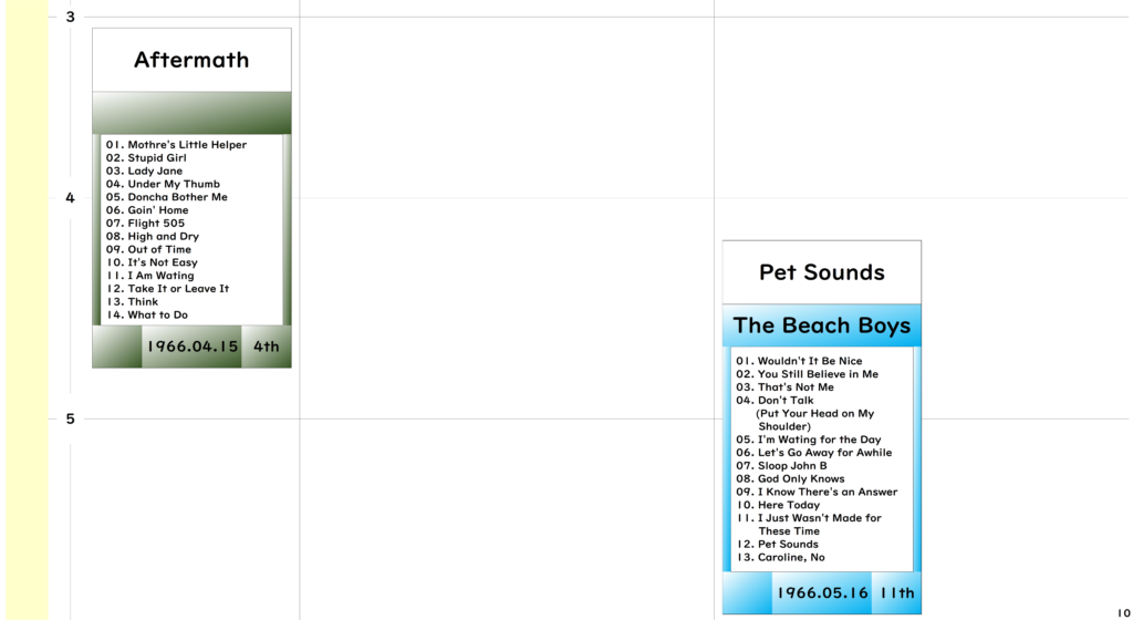 ●その中でも1996年リリース「The Beach Boys」の『Pet Sounds』は前年の「The Beatls」の『Rubber Soul』の影響を大いに受たと言われ、そしてさらにその『Pet Sounds』が今度は翌年の「The Beatles」の『Sgt.Pepper’s Lonely Hearts Club Band』に影響を与えたとされるエピソードはまさにこの時代を象徴するものとして非常に興味深いものがあります。