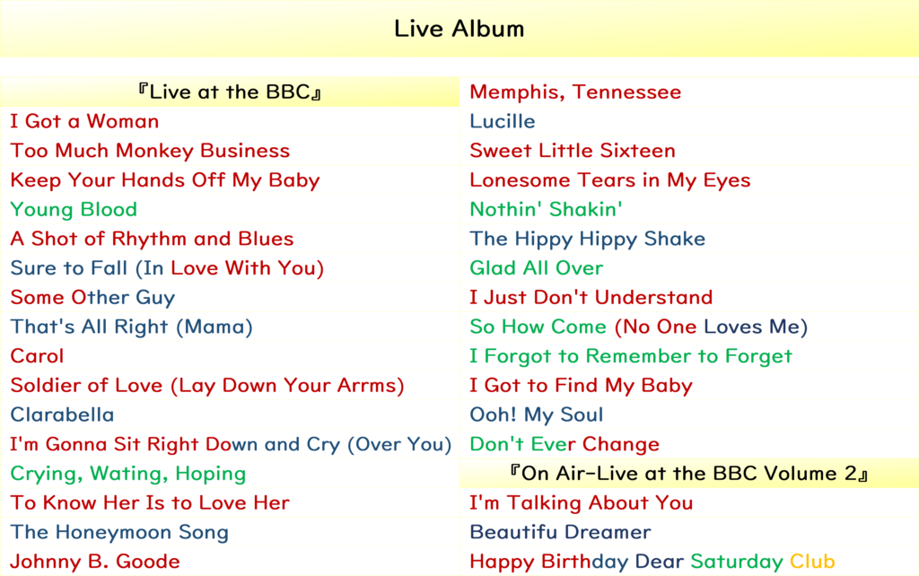 | cover | <record> Elvis Presley/1956.10.19 The Kinks/1964.02.07 The Beatles/ 1963.08.13『Live at the BBC』 1964.05.06(Live)『Anthology 1』 1964.07.16『On Air-Live at the BBC Volume 2』 1964.06.19(EP)『Past Masters Volume One』 Jerry Lee Lewis/1964. |